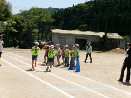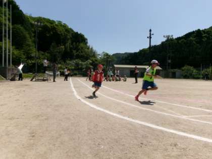 全校リレーの練習をしました。チームの作戦がうまくいくか、試しに走りました。