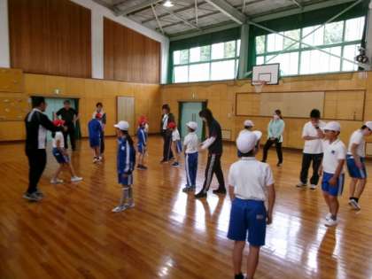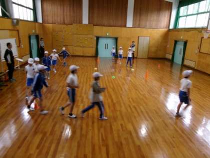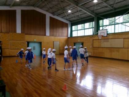 運動場が雨で使えないため、集会室での練習となりました。集団行動と一輪車演技の動きの確認を行いました。