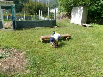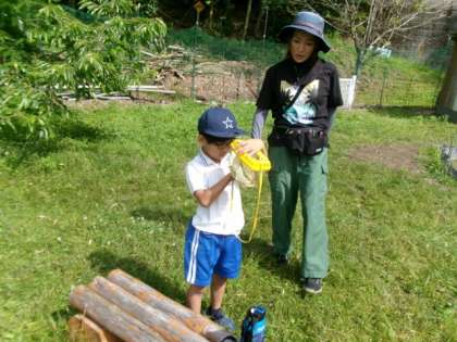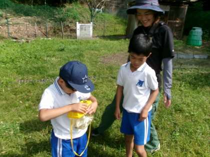 学校園の近くで虫取りをしました。バッタをつかまえました。