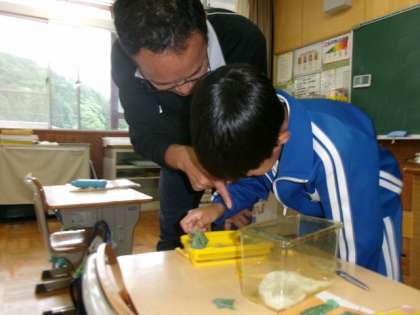モンシロチョウの卵や幼虫を探しました。キャベツについている卵や幼虫を虫かごに入れ、観察しました。