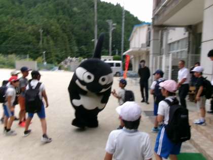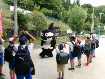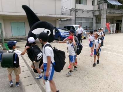 あいさつ運動の一環として、グランパス君が来てくれました。子どもたちはグランパス君と触れ合った後、大きな声であいさつして下校しました。
