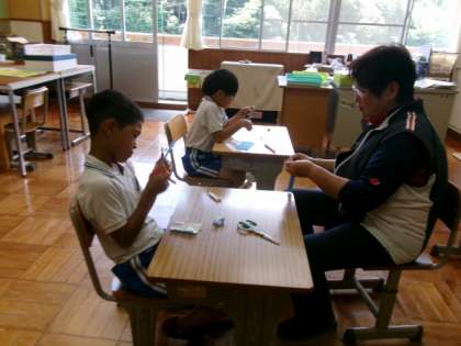 七夕飾りを折り紙を使って作りました。はさみをていねいに使って作りました。