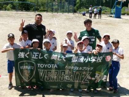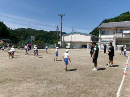 0619 タグラグビー教室 公開日 2024/06/19 更新日 2024/06/19 学校の特色ある活動 トヨタヴェルビリッツの選手を講師に、タグラグビー教室を開催しました。基本的なルールや動きなどを教えていただきました。練習した後は、みんなでゲームを楽しみました。