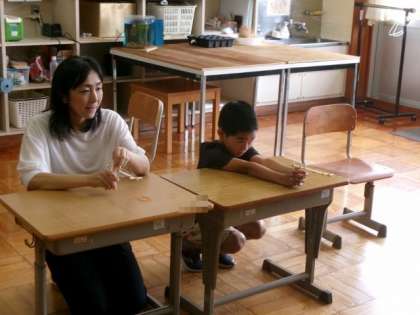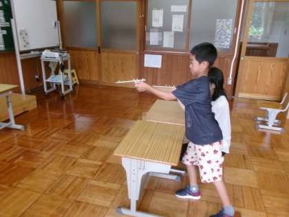 割り箸と輪ゴムを使って、輪ゴムを飛ばす鉄砲を作りました。作った鉄砲で、的あてゲームをしました。