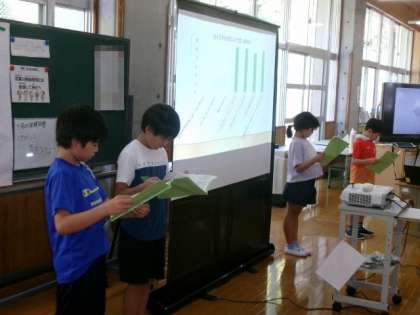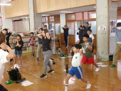 本年度の学校保健委員会は、「楽しくおどってきたえてピンピタしせい!」をテーマに行いました。前半は、姿勢アンケートの結果を保健給食委員の児童が発表しました。後半は、親子で体幹トレーニングダンスをしました。