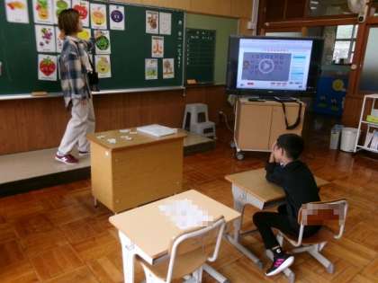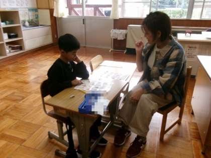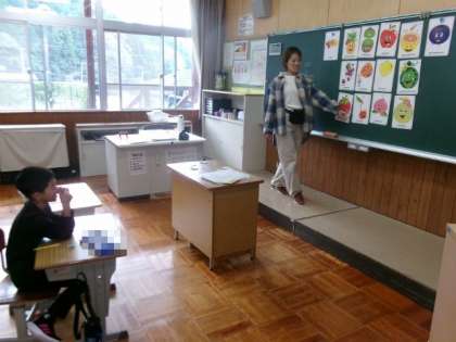 英語で果物を言う練習をしました。練習後には、果物の名前を英語で答えるビンゴゲームをしました。