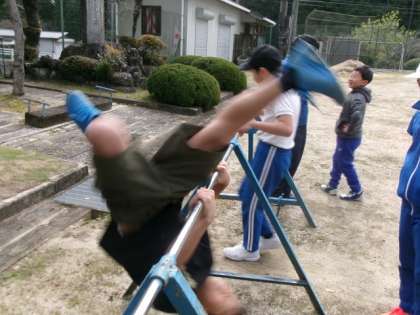 鉄棒運動に取り組みました。自分で目標を立て、技ができるよう練習に励みました。