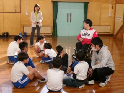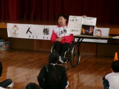 1128 人権教室 公開日 2024/11/28 更新日 2024/11/28 学校の特色ある活動 パラアスリートの加藤尊士氏をお招きして人権教室を開催しました。車いすの人とドッジボールをするときに、みんなが楽しめるルールを考え、やってみました。様々な人がごちゃまぜになって共に生活するにはどうしたらよいか、考えるきっかけとなりました。