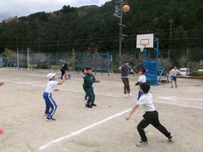運動場で元気よくバスケットボールをしました。