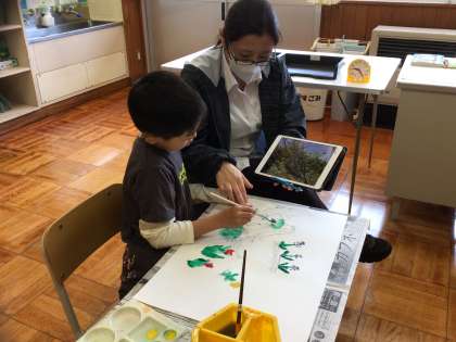 3時間目より 4年生は、外国語活動でルーレットを回し、出たジャンルの英単語を答えることについて取り組んでいました。あさがお学級では、図工で先週に下書きした春の校庭の植物について、色を塗っていました。