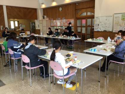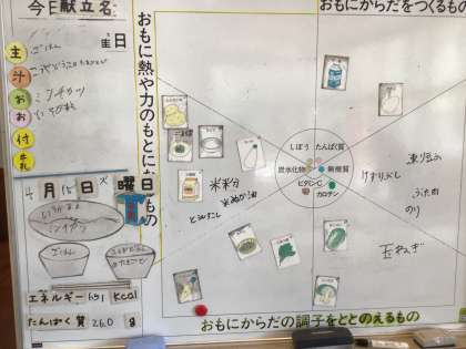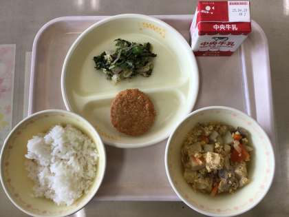 今日の給食は、ご飯、高野豆腐の卵とじ、ミンチカツ、磯香あえ、牛乳です。高野豆腐の卵とじを増やす子が多くいました。