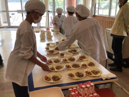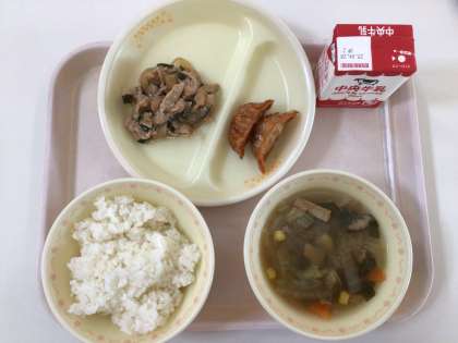 今日の給食は、春雨スープ、ぶたにくのオイスターソース炒め、揚げぎょうざ、ご飯、牛乳です。揚げ餃子が少し余ったので、おかわりをしたい4人で分けました。