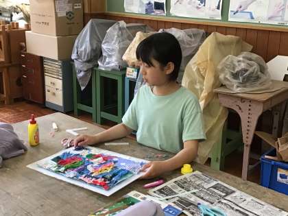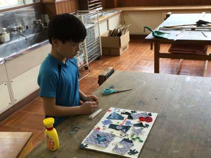 4年生は、図画工作で布を使った貼り絵を作製していました。完成した作品に土台をつけて掲示できるようにしました。