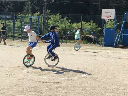 月曜日は雨が降っていたので、久しぶり一輪車の練習です。前後で両手でつないで乗る練習をしています。
