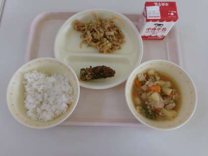 今日の給食は、ごはん、ちくわのお茶揚げ、おかかあえ、じゃがいものそぼろ煮、牛乳でした。