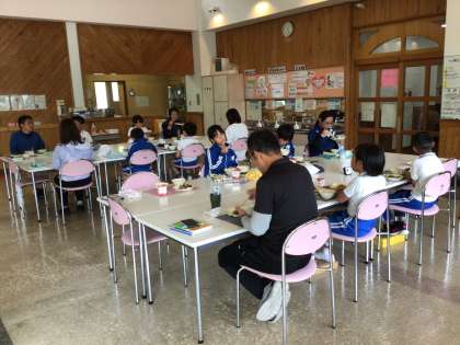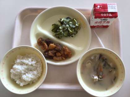 今日の給食♪ 公開日 2025/05/09 更新日 2025/05/09 各学年から 今日の給食は、呉汁(ごじる)、レバーとじゃがいもの甘辛煮、わかめの酢のもの、ごはん、牛乳です。ごじるには、大豆、とうふ、豆乳が入っており、豆づくしでタンパク質がしっかりとれます。 5月の給食は、運動会の赤白各チームで班隊形にして食べています。