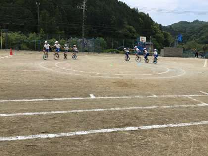 今年度は、一輪車演技、一輪車リレーと、一輪車を使う種目が2つあります。児童8名、全員が乗れるためこの種目を行うことができます。とは言っても、乗れる具合は人それぞれです。特に、競争や演技となると、ただ乗るだけではないため、息を合わせることや速く走ることをがんばります。そのため、なんとかよくしたいなんとか速く走らなきゃ…と焦るため、なかなか乗れなかったりバランスが崩れて落ちてしまったりしてしまいます。本番もどうなるかわかりません。応援お願いします。