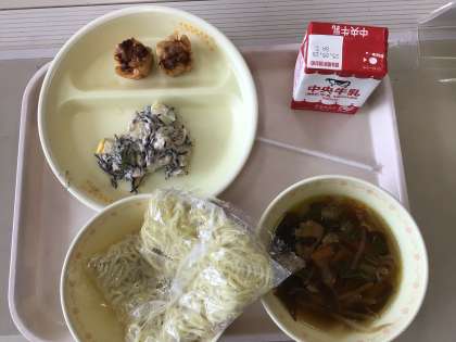 今日の給食は、醤油ラーメン、ひじきサラダ、揚げしゅうまい、牛乳です。麺をおかわりする子が多くいました。