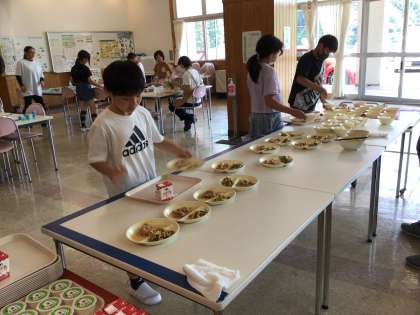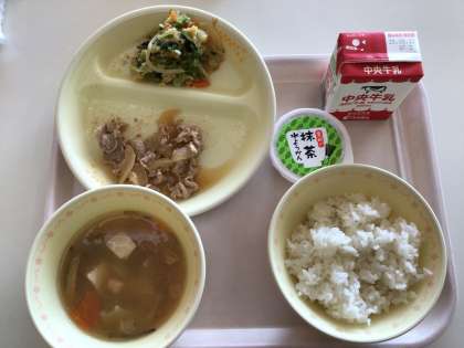 今日の給食は、ごはん、みそ汁、アーモンド和え、とよたひまわりポークのしょうが炒め、抹茶水ようかん、牛乳です。豊田ブランド(豊田市でとれた食材を使用した献立)の日です。お米、ぶた肉、とうふ、油あげ、まっちゃが豊田ブランドです。