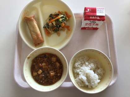 5/22(木)今日の給食♪ 公開日 2025/05/22 更新日 2025/05/22 各学年から 今日の給食は、マーボー豆腐、ナムル、春巻き、ごはん、牛乳です。春巻きが少し余っていましたが、おかわりを希望する子が多くいました。