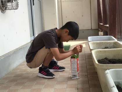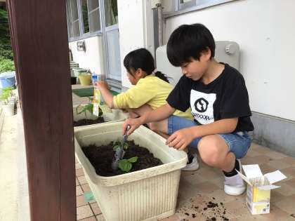 理科の授業でゴーヤの苗を植え替えていました。