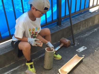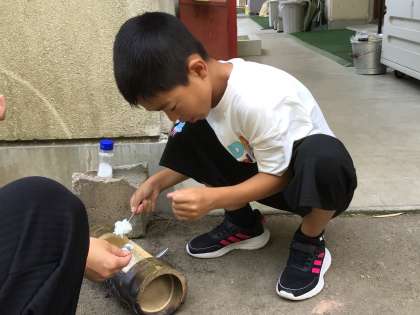5・6年生の調理実習が終わった後、あさがお学級でも竹でご飯を炊きました。竹を切ることから始め、竹にお米と水を入れ、その竹を火に入れて炊きました。こちらもほんのりと竹の香りのする美味しいご飯ができました。