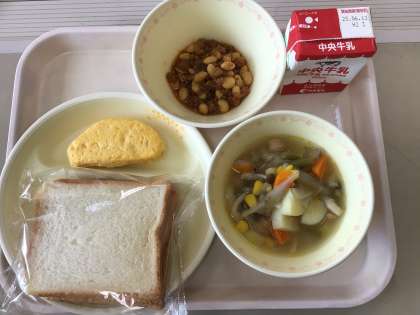 今日の給食は、スライスパン、根菜のスープ煮、オムレツ、チリコンカンです。かみかみ献立は根菜のスープ煮です。根菜スープには、ゴボウやにんじん、しめじ、ジャガイモ等、たくさんの野菜が入り、ソーセージも入ってかみごたえがあります。チリコンカンには大豆がたくさん入っており、植物性のタンパク質がしっかりとれます。
