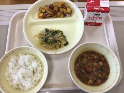 6/11(水)今日の給食♪ 公開日 2025/06/11 更新日 2025/06/11 各学年から 今日の給食は、マーボー豆腐、大学いも、中華あえ、ご飯、牛乳です。大学いもが食べやすいように、細かく切ってあります。