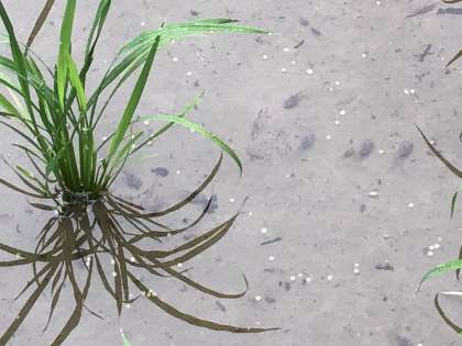 5月9日に田植えをしましたが、稲が順調に育っています。5・6年生の旗揚げ当番が毎日、稲の様子を見に行き異常があったら対応できるようにしています。最近の大雨で田んぼに水があふれていないか心配しましたが、ちょうどよい水の高さになっていました。また、おたまじゃくしもたくさん泳いでいました。