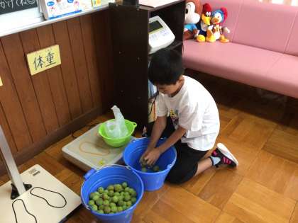 4年生は道徳「自分の命はだれのものか考えよう」について取り組みました。「いのちのまつり」というお話を読んで考えました。あさがお学級は、算数の学習として、重さを測る学習に取り組みました。初めに1kgというのはどのぐらいの重さか考えるために、保健室にあるものの中で1kgのものは何があるか考え、熱中症対応のバッグが1kgぐらいだと考えました。実際測ってみると、1.1kgでほぼ当たりました。すごい! その後、昨日収穫した梅の実を1kgずつ分けるために体重計を使って測りました。