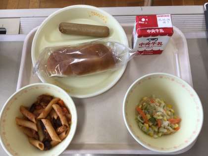6/23(月)今日の給食♪ 公開日 2025/06/23 更新日 2025/06/23 各学年から 今日の給食は、米粉パン、なすとペンネのトマト煮、フランクフルト、コールスローサラダ、牛乳です。米粉パンは弾力があり美味しいです。