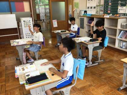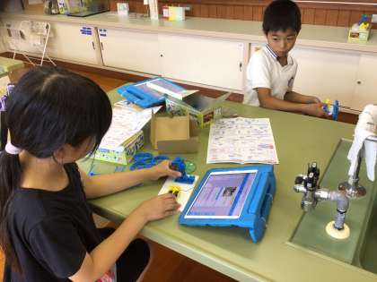 午前に水泳学習があると、児童も教師も午後の授業は体が疲れていて大変ですががんばっています。5・6年生は社会の授業で「貴族のくらし」についてまとめる準備をしていました。4年生は、理科の授業で「乾電池を使ったおもちゃをつくろう」に取り組んでいました。部品をうまく組み合わせながら作っています。この後、車を走らせました。電池の力もあり、廊下をすうっと走りました。