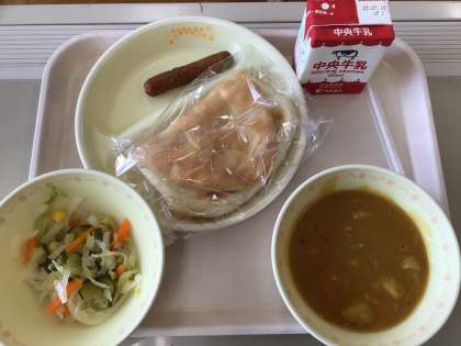 今日の給食は、チキンカレー、ナン、サワーキャベツ、ウインナーです。ナンが子どもたちに人気があります。