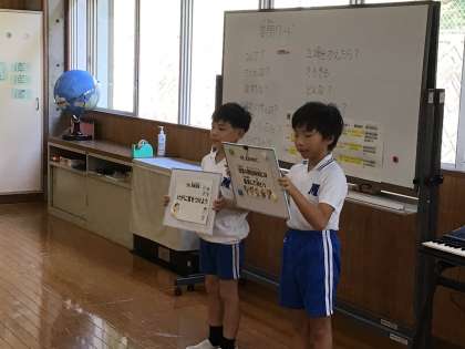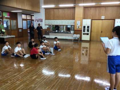 今日は、夏休み明け最初の登校日でもあるため、集会を行いました。休み明けで眠たかったかもしれませんが、顔をあげてしっかり話を聴くことができました。委員会から、今月の目標について連絡がありました。保健の目標は「けがに気をつけよう」、生活のめあては「授業の開始時刻には着席をして待とう」です。