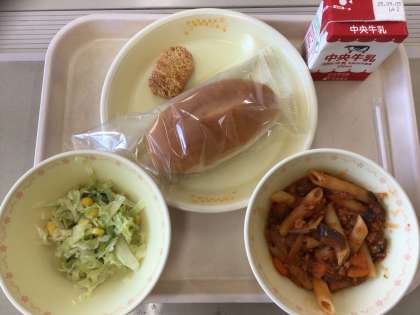 今日の給食は、ナスとペンネのトマト煮、米粉パン、コーンサラダ、チキンナゲット、牛乳です。「いただきます」の前に、「正しい箸の使い方とマナー」についてのお話があり、箸の正しい持ち方について確認しました。