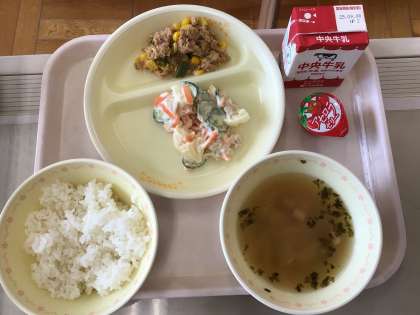 9/2(火)今日の給食♪ 公開日 2025/09/02 更新日 2025/09/02 各学年から 今日の給食は、ツナそぼろ丼、みそ汁、ジャガイモと大豆のサラダ、ご飯、プチゼリー(アセロラ)、牛乳です。今日は防災献立です。みそ汁が備蓄用のものです。9月に入り、昨日から給食を食べる席の席替えをしました。