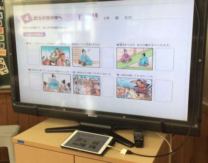 社会の授業で鎌倉時代「武士の世の中へ」について学習しています。教科書にある二次元コードを読み取るとワークシートが出てきます。今日の授業は、このワークシートにあるマンガを見て、吹き出しの言葉を考えることで、御恩と奉公について学びます。