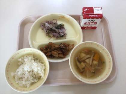 今日の給食は、レバーと大豆のごまがらめ、すまし汁、ゆかりあえ、ご飯、牛乳です。今日は、いただきますの前に、箸の使い方について、委員会の児童からお話がありました。かき箸、振り上げ箸、持ち箸について等、やらない方がいい箸の使い方について知りました。