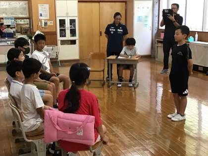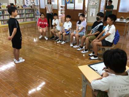 今日はスピーチ集会です。今日のスピーチ担当は6年生の児童です。題は「夏休みの思い出」です。夏休みにあったサッカーの大会で銀メダルをとった時の思い出を話しました。
