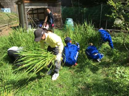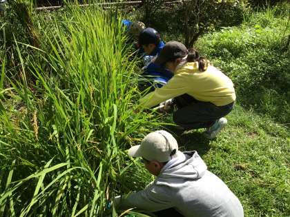 今日は稲刈りをしました。獣に荒され稲が倒され、食べられそうな実がついた稲はほとんどありませんが、使えそうな実はこの後脱穀し、精米できればと考えています。腰を落として稲の根本を持ち、鎌でザクっと刈る作業はやってみるとどれくらい大変なことか痛感することができます。いねを持った感触や鎌でザクっと切った感触、稲から伝わってくる草のにおい等は体感として残ると思います。かけがえのない体験ができたと思います。
