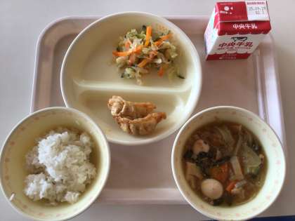 今日の給食は、八宝菜、揚げ餃子、バンサンスー、ごはん、牛乳です。今日は養護教諭の先生がお誕生日のため、いただきますの前にみんなでお祝いの拍手をしました。