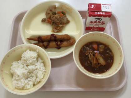 9/25(木)今日の給食♪ 公開日 2025/09/25 更新日 2025/09/25 各学年から 今日の給食は、キムチ入りみそ汁、ししゃもフライ、れんこんのきんぴら、ごはん、牛乳です。今日も3人の給食当番でがんばりました。今日は、5・6年生の担任の先生が誕生日なので、いただきますの前にみんなで拍手でお祝いしました。