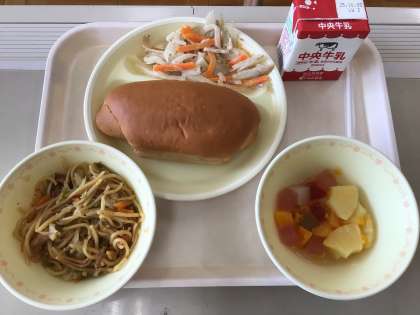 今日の給食は、焼きそば、根菜サラダ、クロロールパン、フルーツゼリーミックス、牛乳です。今日は久しぶりに児童が全員そろって給食が食べられます。
