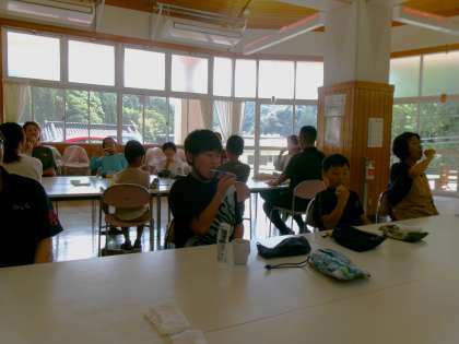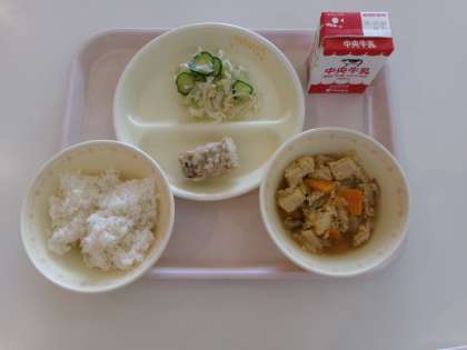 今日の給食は、ごはん、たちうおのから揚げ、たくあんあえ、高野豆腐の卵とじ、牛乳です。今日の写真は、食後の歯磨きの様子です。みんな黙々と歯磨きをしています。