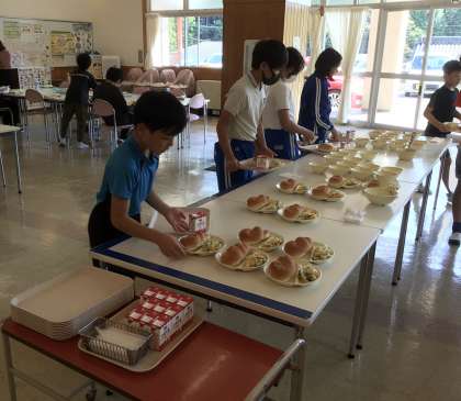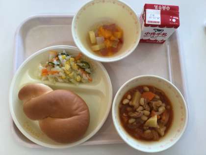 今日の給食は、ポークビーンズ、フレンチサラダ、ツイストパン、フルーツゼリーミックス、牛乳です。今日は、姿勢をよくして食べようという保健給食委員からの声掛けがありました。