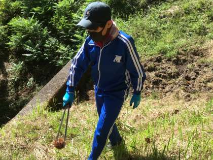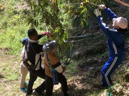 今日は待ちに待った栗ひろいをしました。先々週ぐらいから、栗ひろいを計画していましたが、まだ栗が開いていないということで様子を見ていました。鳥や虫やイノシシ等が栗の実を食べてしまうのが早いか、拾うのが早いか、収穫の時期が難しいです。今日は、長そで長ズボン、虫よけスプレーと、完全防備で挑みました。栗はだいぶ落ちていましたが、まだ、緑色の栗が枝にたくさんついており、ゆらして落としました。子どもたちは、上手に靴でイガをむいていました。