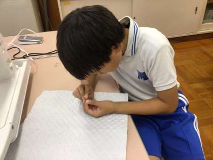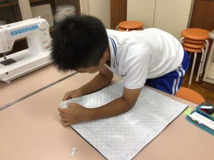 6年生は、家庭科「思いを豊かにして 生活を豊かに」自分の作りたいものをていねいにつくろうをめあてにして、トートバッグに取り組んでいます。6年生もミシンぬいの前にしつけをしています。