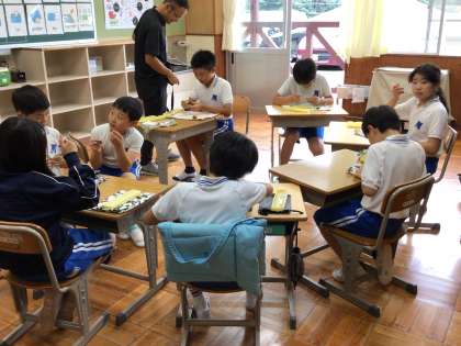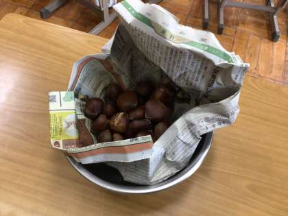 10/10(金)焼き栗を食べました! 公開日 2025/10/10 更新日 2025/10/10 学校の特色ある活動 先日、収穫した栗を七輪で火にかけ、焼き栗にしました。栗をむくのは少し大変でしたが、一生懸命にスプーンで実をすくって食べました。あたたかく甘くいい香りもして美味しくいただきました。