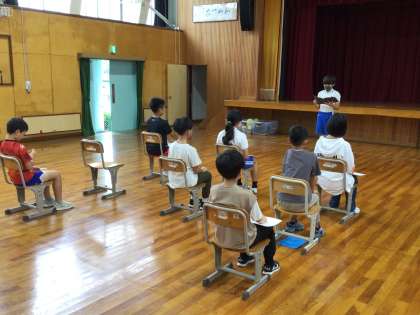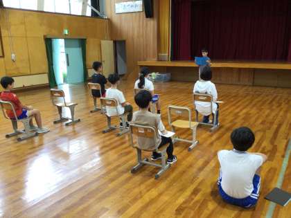 前期終業式を兼ねて後期始業式を実施しました。また、式の前に作文や詩、読書感想文作品の表彰を行いました。式では、最初に代表児童が「前期にがんばったことと後期にがんばりたいこと」のスピーチを行いました。児童は、前期にがんばったこととして、水泳や一輪車などがんばった思いや取組の様子等について思いを込めて発表しました。