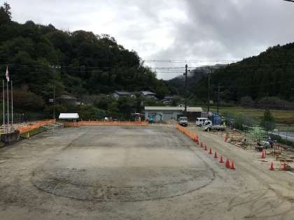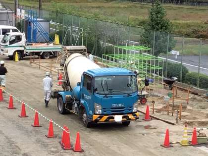 昨日設置されたジャングルジムの土台の部分に雨がたくさん溜まり、業者の方が必死に水をかき出していました。この後、コンクリートを入れて固めていきます。